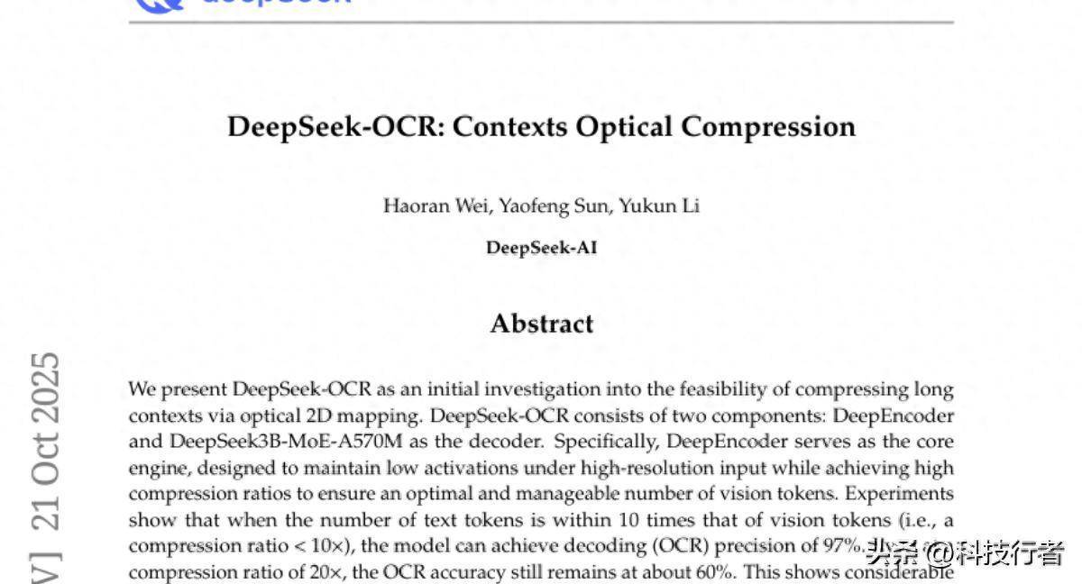 当我们谈论人工智能的发展时,有一个有趣的现象值得关注:人类能够一眼看到一张包含大量文字的图片,就立刻理解其中的内容,但让计算机做同样的事情却异常困难。更有意思的是,如果我们能让计算机像人类一样"看图读字",是否能解决大语言模型处理超长文本时面临的计算瓶颈问题呢?这项由DeepSeek-AI研究团队的魏浩然、孙耀峰、李玉昆等研究者完成的突破性工作发表于2025年10月,论文编号为arXiv:2510.18234v1。研究团队开发了一个名为DeepSeek-OCR的创新模型,首次系统性地探索了通过"光学压缩"技术来处理超长文本的可能性。简单来说,他们让计算机学会了把大段文字"拍成照片",然后通过"看照片"来理解内容,而不是逐字逐句地阅读,从而大幅提升了处理效率。这项研究的核心理念来源于一个古老的说法:"一图胜千言"。研究团队发现,当我们把一篇包含1000个文字的文档转换成图像时,计算机只需要用不到100个"视觉标记"就能准确理解其内容,相当于实现了10倍以上的压缩比。更令人惊讶的是,即使在20倍压缩比的极端情况下,模型仍能保持60%的准确率。这就像是把一本厚厚的小说压缩成一张概览图,却仍能让读者理解故事的主要情节。DeepSeek-OCR模型由两个核心组件构成,就像一个高效的"翻译系统"。第一个组件叫做DeepEncoder,可以想象成一个专业的"摄影师",它的任务是将文档图像转换成计算机能够理解的压缩信息。第二个组件是DeepSeek3B-MoE解码器,相当于一个经验丰富的"阅读专家",负责从压缩信息中准确还原出原始文本内容。一、革命性的DeepEncoder:重新定义视觉文本理解要理解DeepEncoder的工作原理,我们可以把它比作一个高效的文档扫描系统。传统的文本处理方式就像用放大镜逐字逐句地阅读一本书,每个字都需要单独处理,效率极其低下。而DeepEncoder则采用了一种全新的"快照式阅读"方法。DeepEncoder的内部结构体现了精妙的设计哲学。它由两个主要部分组成:第一部分基于SAM(Segment Anything Model)架构,包含约8000万参数,专门负责感知和识别图像中的文字细节;第二部分基于CLIP架构,包含约3亿参数,负责理解文字的含义和上下文关系。这两个部分之间通过一个16倍压缩模块连接,就像一个精密的"信息过滤器",确保在保留关键信息的同时大幅减少数据量。这种设计的巧妙之处在于分工明确:第一部分专注于"看清楚",使用窗口注意力机制仔细观察图像的每个局部区域,确保不遗漏任何重要细节;第二部分专注于"理解好",使用全局注意力机制把所有信息整合起来,形成对整个文档的完整理解。这就像一个经验丰富的速读专家,既能快速浏览全文把握大意,又能准确捕捉关键细节。更值得注意的是,DeepEncoder支持多种分辨率模式,从512×512到1280×1280不等,甚至还有一种叫做"Gundam模式"的动态分辨率处理方式。这种灵活性让模型能够根据文档的复杂程度自动调整处理策略,就像一个智能相机能够根据拍摄场景自动选择最佳设置一样。二、数据引擎:构建多语言文档理解的知识宝库DeepSeek-OCR的强大能力离不开其丰富多样的训练数据。研究团队构建了一个庞大的数据引擎,就像建造一座包罗万象的图书馆,收录了各种类型的文档和图像。这个数据引擎包含四个主要类别的训练素材。首先是OCR 1.0数据,主要包括传统的文字识别任务,涵盖了3000万页的PDF文档,支持约100种语言。这些文档就像是基础的读物,帮助模型学会最基本的"看字识词"能力。研究团队不仅收集了粗略标注的文档(通过自动提取获得),还人工制作了精细标注的样本,包括200万页中文文档和200万页英文文档,这些精细标注包含了文档的布局信息和文字的精确位置。接下来是OCR 2.0数据,这部分更像是"专业课程",包括图表解析、化学公式识别和几何图形理解等高级任务。研究团队使用专业工具生成了1000万张图表图像,主要包括常见的线图、柱状图、饼图和复合图表。对于化学公式,他们从PubChem数据库获取SMILES格式的化学结构,然后渲染成图像,构建了500万个化学公式样本。几何图形方面,他们参考了Slow Perception方法,生成了100万个平面几何解析样本。第三类是通用视觉数据,占总训练数据的20%左右。这些数据让DeepSeek-OCR不仅仅是一个文档处理工具,还具备了一定的通用图像理解能力,就像让一个专业的文字专家同时具备了基本的图像常识。最后一类是纯文本数据,占训练数据的10%。这部分数据确保模型保持了良好的语言理解能力,不会因为过度专注于视觉处理而失去对语言本身的敏感性。三、训练策略:从基础认知到高级理解的渐进学习DeepSeek-OCR的训练过程采用了一种渐进式的学习策略,就像培养一个从初学者到专家的成长路径。整个训练分为两个主要阶段,每个阶段都有明确的目标和任务。第一阶段专门训练DeepEncoder,就像先让学生学会基本的阅读技能。在这个阶段,研究团队使用了所有的OCR数据和从LAION数据集采样的1亿通用图像数据。训练采用了下一个词预测的框架,让模型学会从视觉信息中准确预测文本内容。这个过程持续了2个周期,使用了1280的批次大小,学习率设置为5e-5,序列长度为4096。第二阶段是整个DeepSeek-OCR模型的联合训练,相当于让已经掌握基本技能的学生开始处理复杂的综合问题。在这个阶段,模型需要学会将DeepEncoder提取的视觉特征与语言模型的文本生成能力完美结合。训练数据的配比经过精心设计:OC