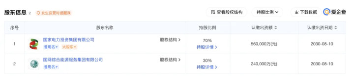 股东信息显示,国家电力投资集团有限公司与国网综合能源服务集团有限公司为新公司的两大股东,分别出资56亿元与24亿元,持股比例分别为70%与30%。