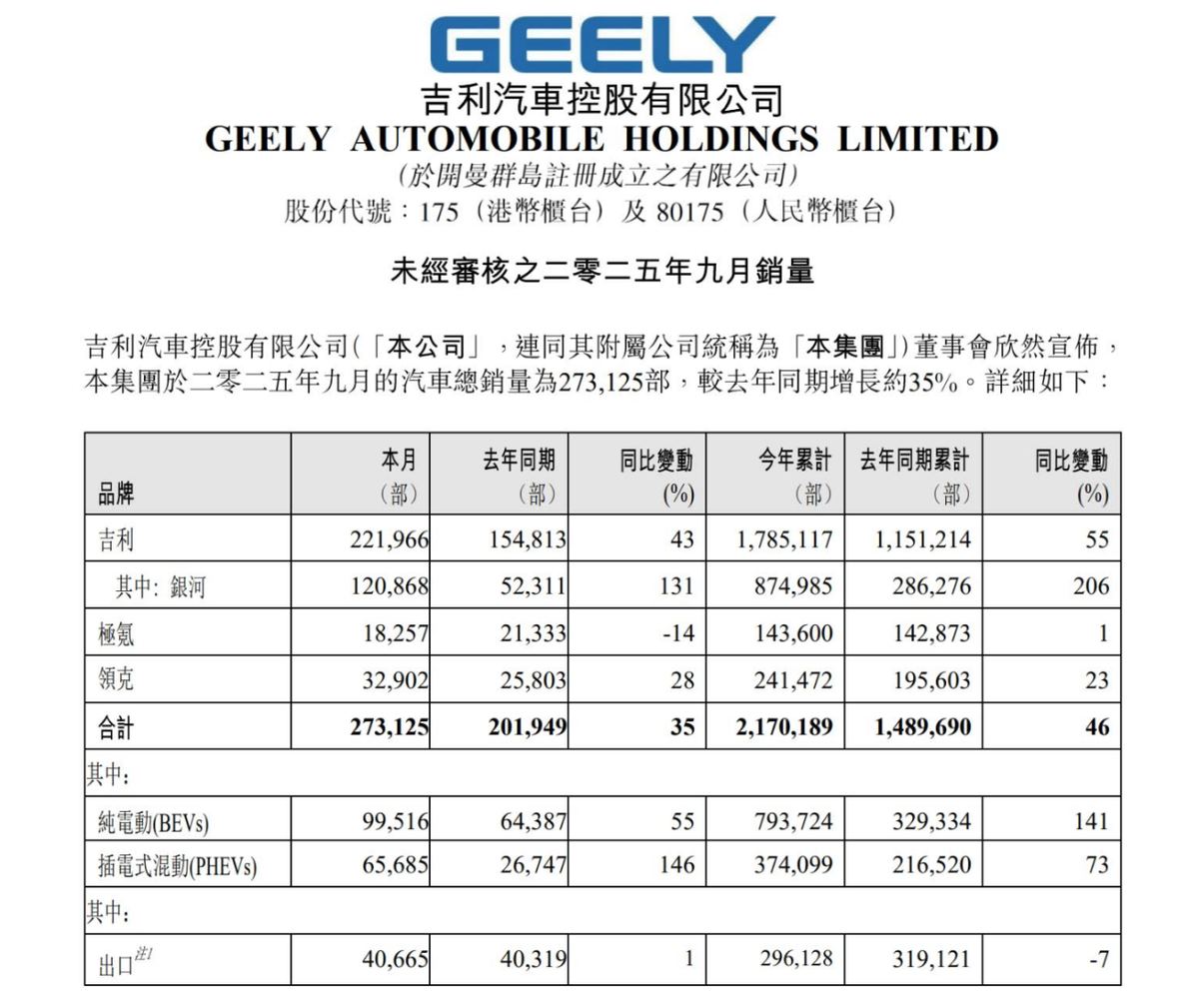 极氪品牌9月交付18257辆,环比增长4%;三季度累计交付5.3万辆,环比增长7%。前9个月累计交付超14万辆。9月29日,全球超豪华SUV新旗舰极氪9X正式上市,推出四个版型,限时售价45.59万元起,仅13分钟大定订单突破1万辆,与极氪009共同构成“双旗舰”布局。此外,焕新极氪001已于9月底开启预售,预计10月11日正式上市。